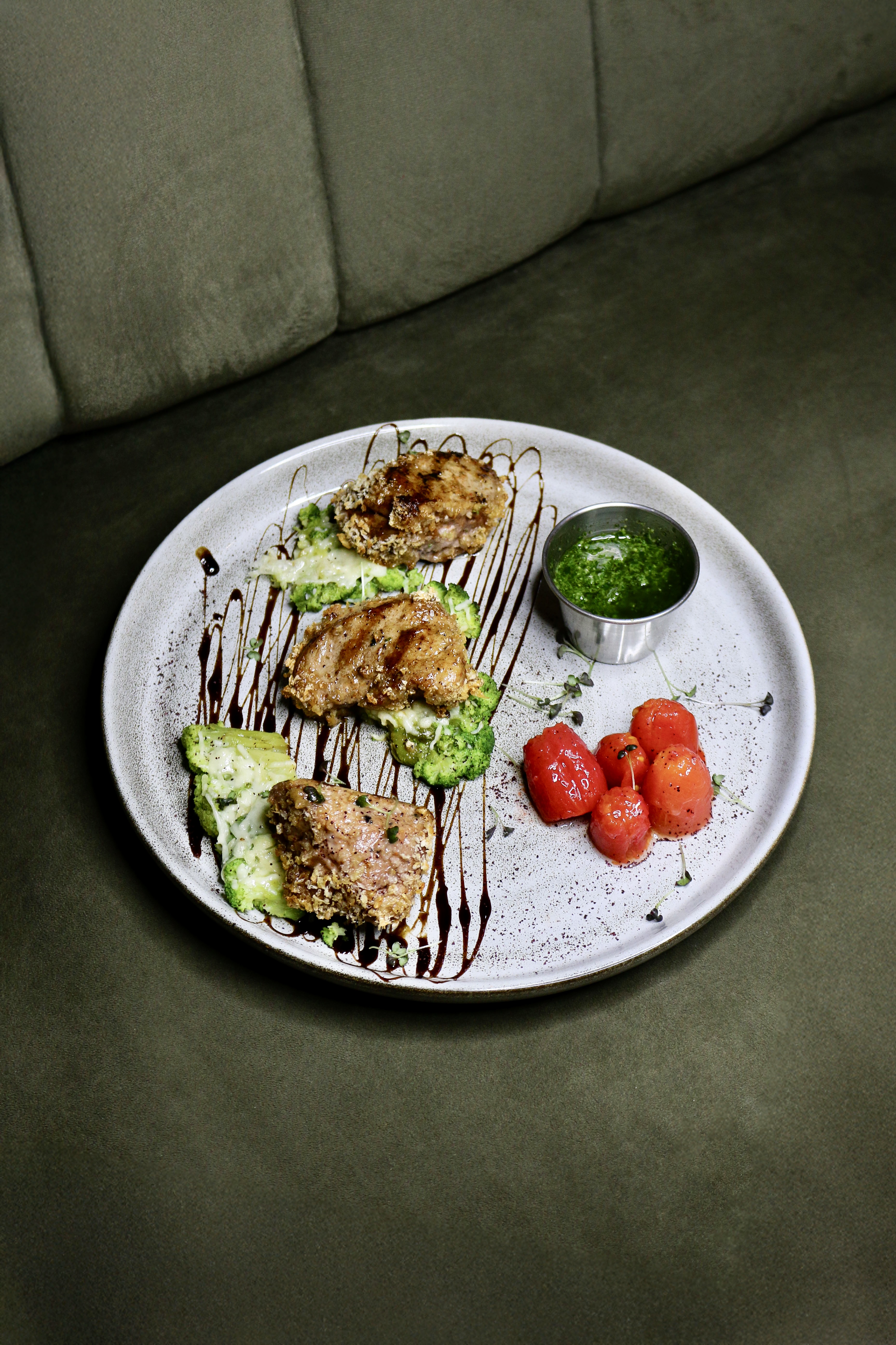 Вирізка свинини з броколі під пармезаном та соусом песто